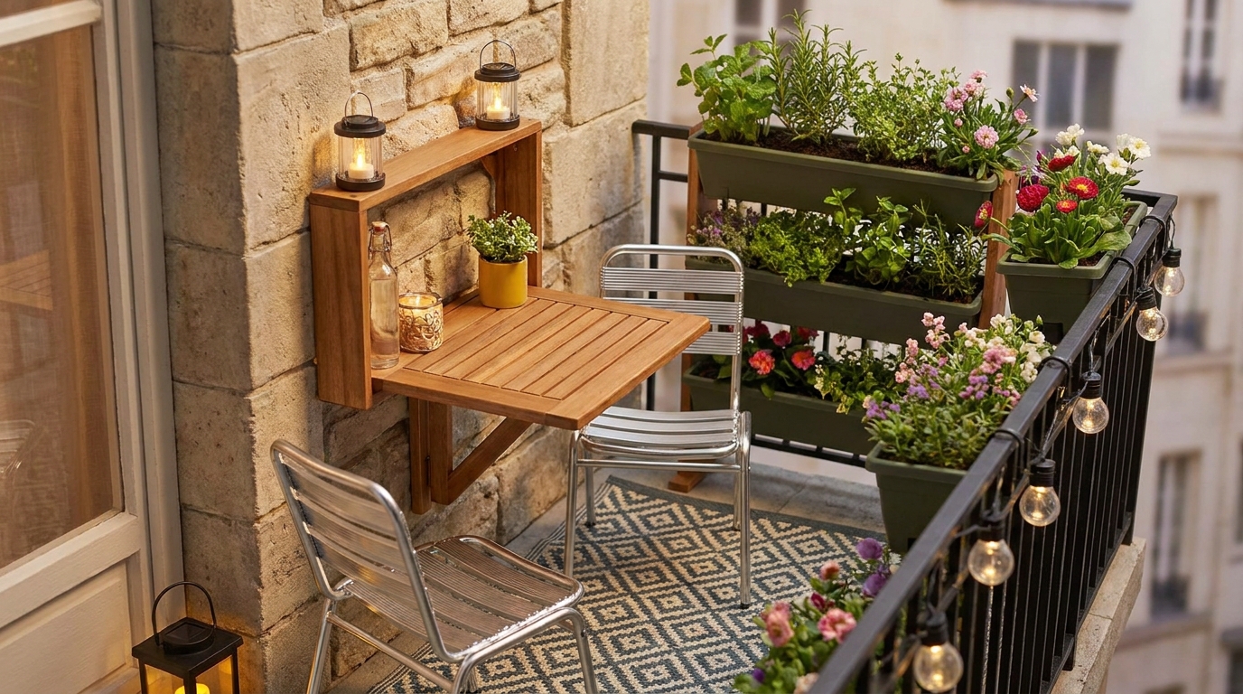 in Balcon / terrasse Mon voisin dîne dehors tous les soirs sur un balcon de 2 m² : il m’a montré ce qu’il a fixé au mur, et j’ai compris