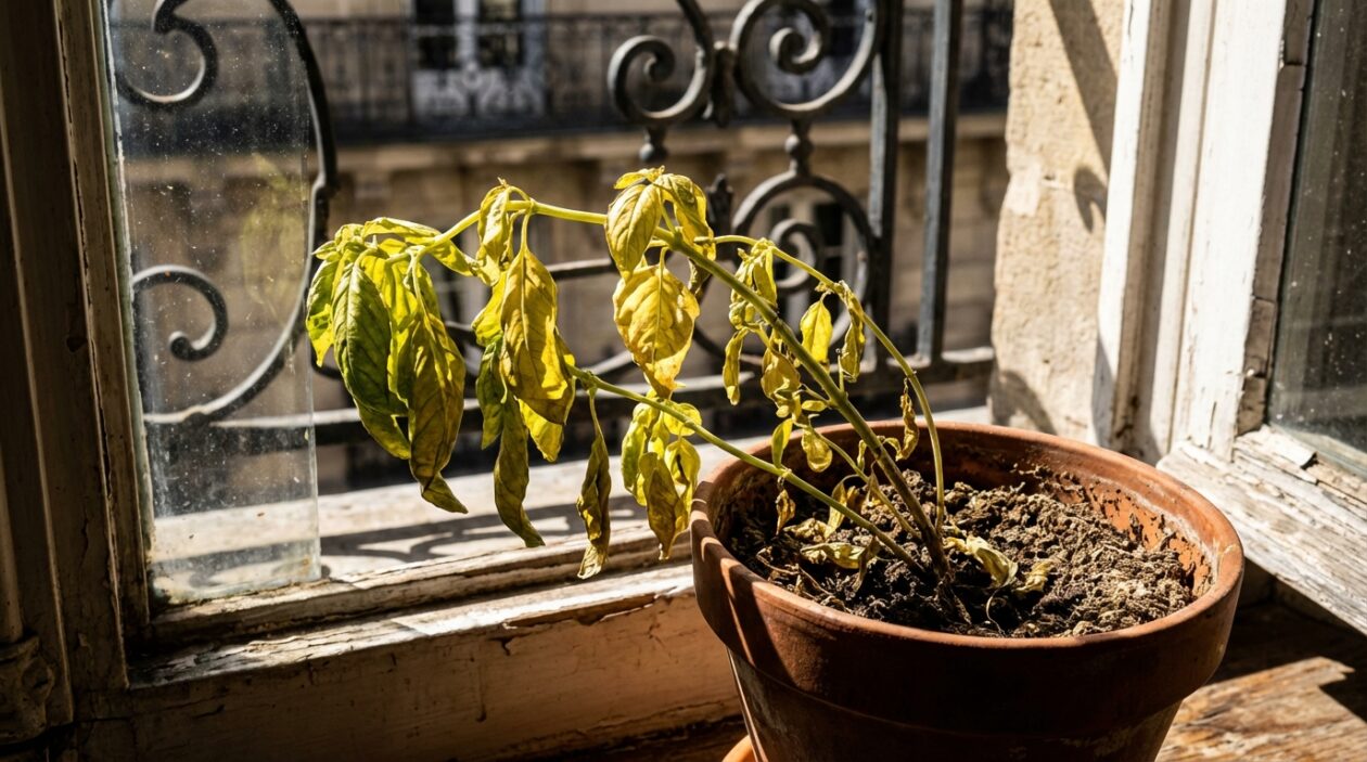La seconde erreur fatale consiste à placer le pot flambant neuf directement derrière une vitre exposée plein sud pour qu’il « prenne le soleil ». Habituée à un éclairage artificiel tamisé, la plante subit de graves brûlures sur ses jeunes feuilles tendres. Le terreau, confiné dans un pot en plastique inadapté, surchauffe en quelques heures. Les racines cuisent et la déshydratation devient irréversible, même avec un arrosage de sauvetage.